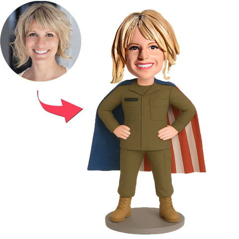 Female Soldier Wearing American Flag Cape Custom Bobbleheads