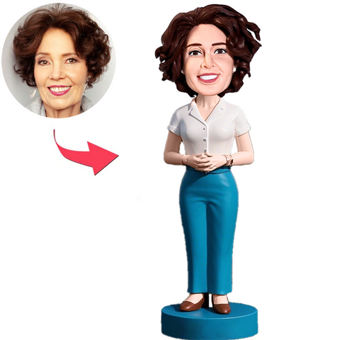 Woman Wearing White Shirt and Cyan Pants Custom Bobbleheads