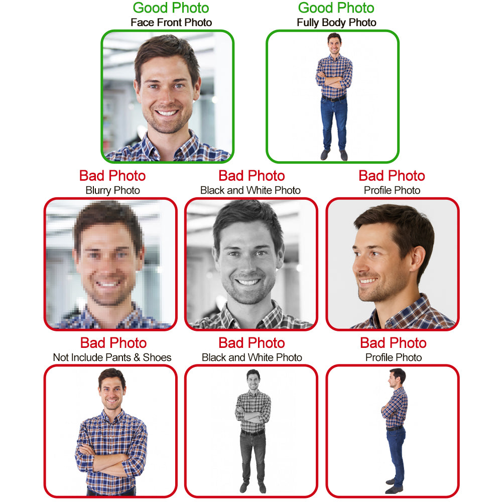 For specific outfits, poses, pets, or text requests, please send full-body photos and details to support@custombobbleheads.us. A dedicated representative will provide one-on-one assistance.